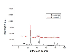 XRD pattern of exposed graphite indicates that many new planes have been developed (unmarked peaks) as shown in Fig. IV. SAED pattern of the exposed sample is also indicative of development of new planes due to the thermal load deposited onto the sample. |